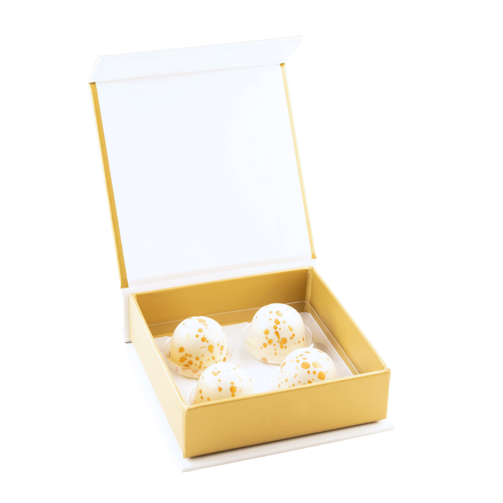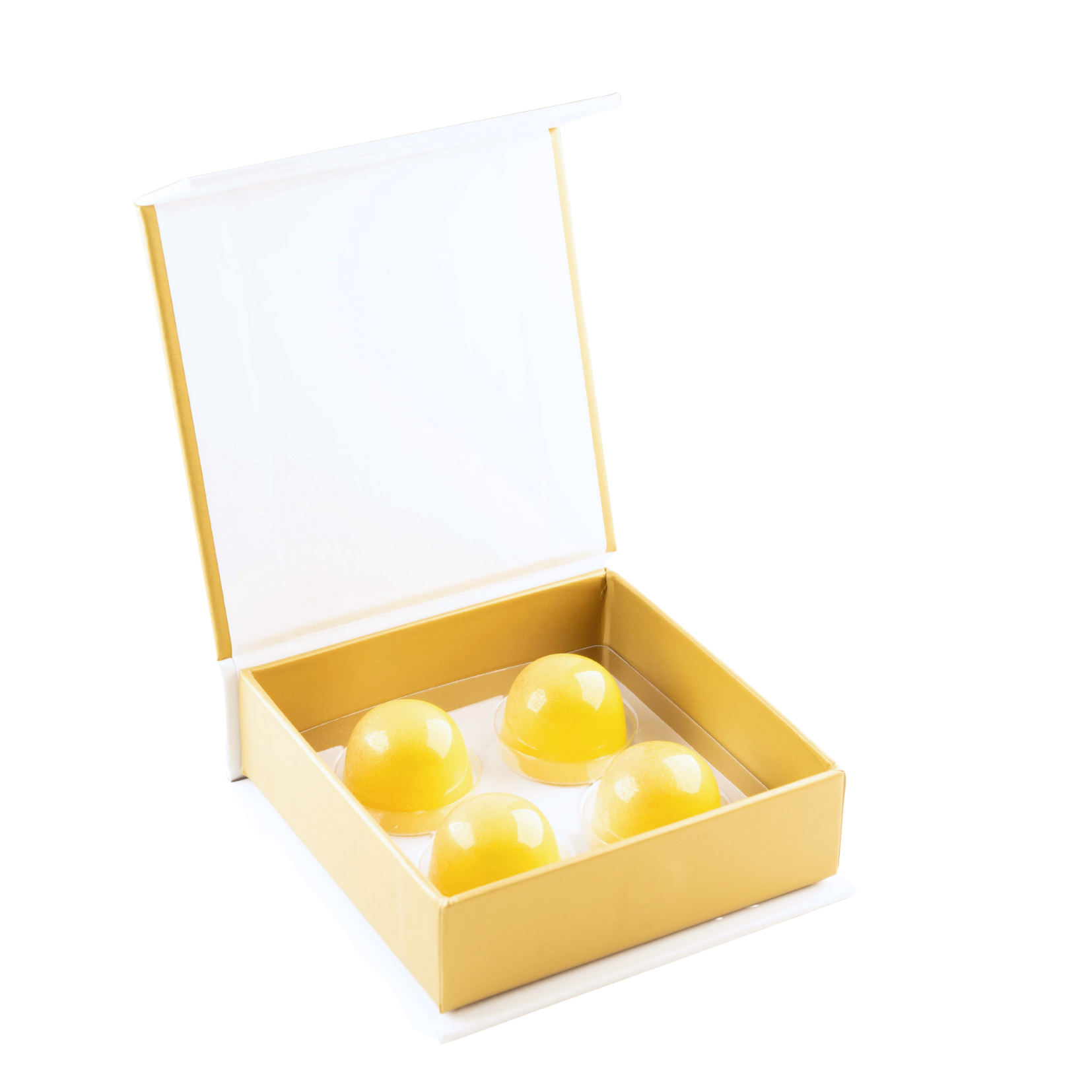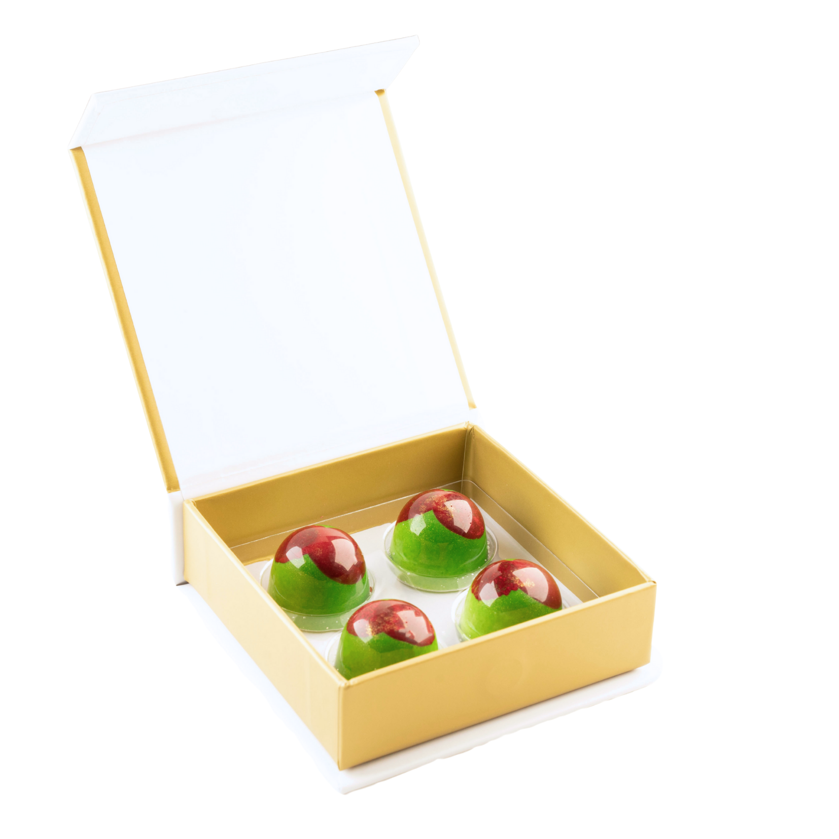 Vit choklad fylld med körsbärskompott och körsbärsganache, strösslad med syrligt socker.